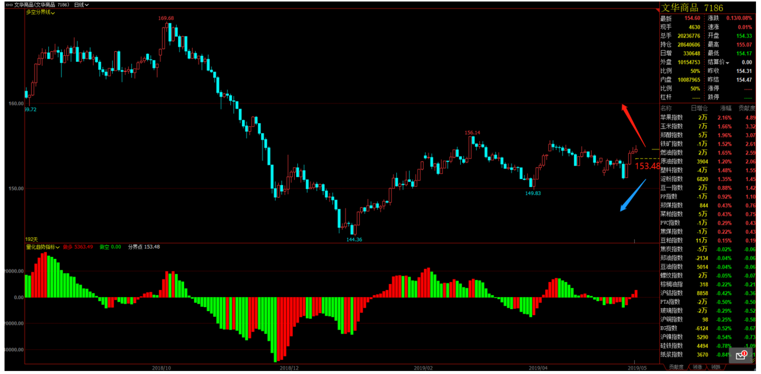 圖二:依據多空分界線和量化趨勢系統提示,文華商品指數日線級別多空分界點為153.48點,即153.48點之上為多頭行情,之下為空頭行情。昨日收盤為154.31 點,即日線級別目前處于多頭行情,可尋找能做多的商品期貨品種。如跌破153.48點多頭轉空頭,即要尋找可做空的商品期貨品種。
