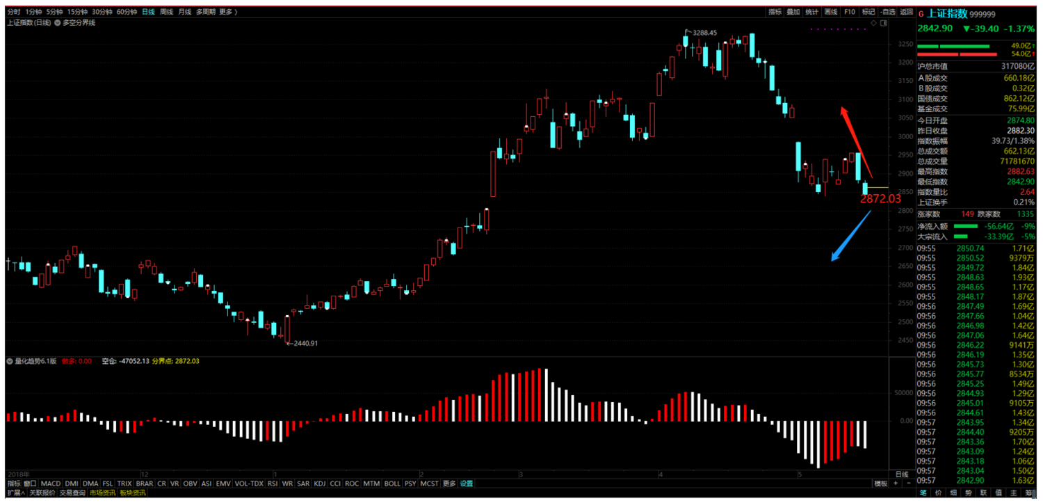 2023.03.10 量化交易系統對上證指數和文華商品指數的解析圖一:依據多空分界線和量化趨勢系統提示,上證指數日線級別今日多空分界點為2872.03點,即2872.03點之上為多頭行情,之下為空頭行情。昨日收于2882.30點,日線級別目前處于空頭行情,適宜做空,如突破破2872.03點即可入場。