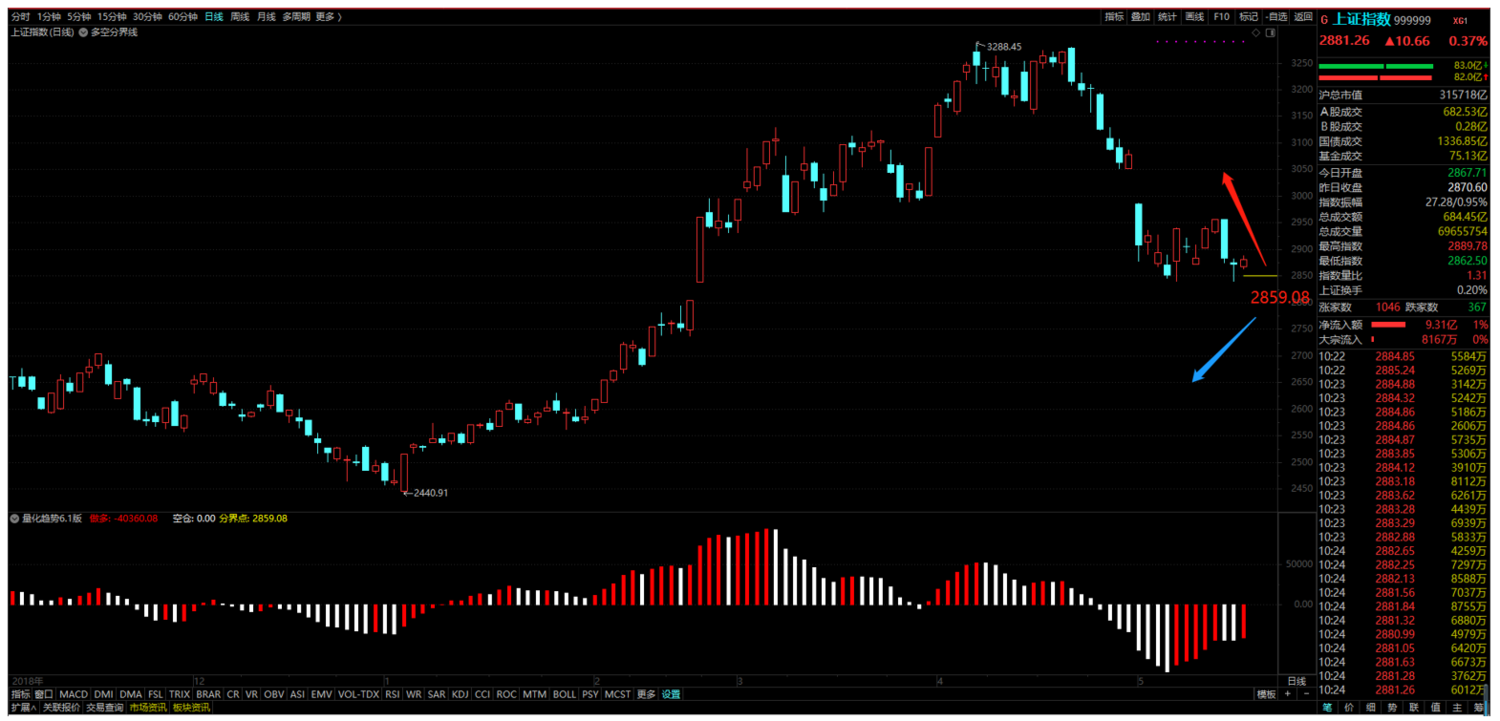 2023.03.13 量化交易系統(tǒng)對上證指數(shù)和文華商品指數(shù)的解析圖一:依據(jù)多空分界線和量化趨勢系統(tǒng)提示,上證指數(shù)日線級別今日多空分界點為2859.08點,即2859.08點之上為多頭行情,之下為空頭行情。昨日收于2870.60點,日線級別目前處于多頭行情,適宜持倉買入股票,如跌破2859.08點即可離場賣出股票。