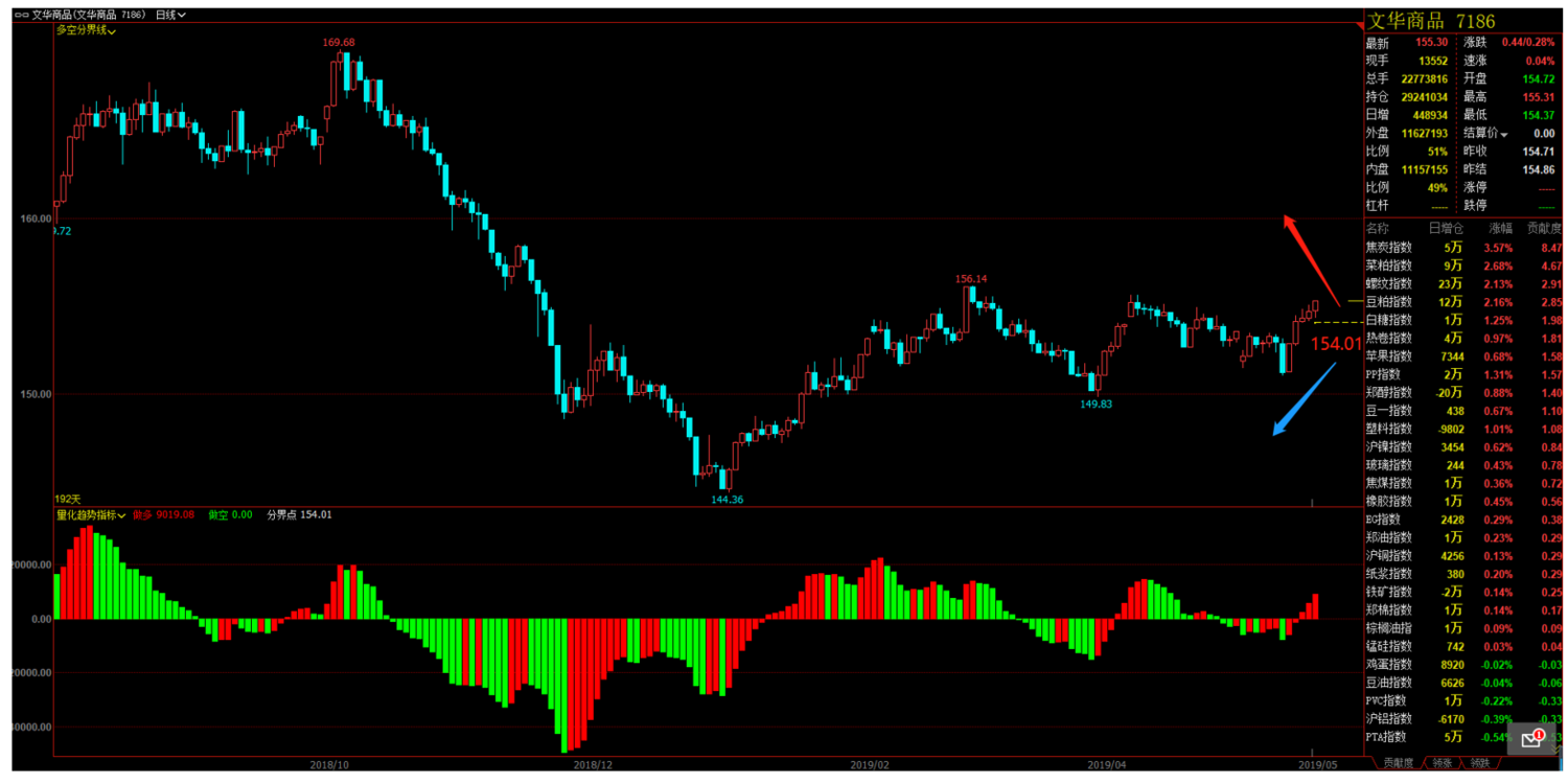圖二:依據(jù)多空分界線和量化趨勢系統(tǒng)提示,文華商品指數(shù)日線級別多空分界點為154.01點,即154.01點之上為多頭行情,之下為空頭行情。昨日收盤為154.71 點,即日線級別目前處于多頭行情,可尋找能做多的商品期貨品種。如跌破154.01點多頭轉(zhuǎn)空頭,即要尋找可做空的商品期貨品種。